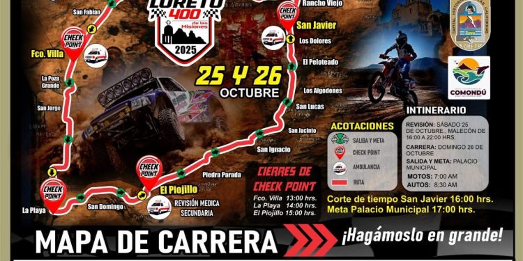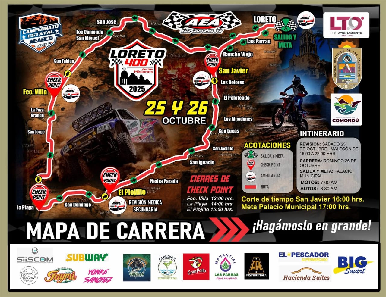 Castañeda Davis agregó que la tarde del 25 de octubre, se llevará cabo la revisión mecánica e inscripción de los equipos, mientras que el banderazo de salida se dará el día 26 muy temprano, la carrera iniciará y finalizará en Loreto recorriendo varios puntos de los municipios de Loreto y Comondú. Los horarios de revisión mecánica y salida de motos y autos se darán a conocer con la debida anticipación.