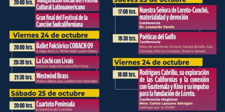 Loreto B.C.S. 13 de octubre, 2025.- El XI Ayuntamiento de Loreto en coordinación con el Gobierno del Estado de Baja California Sur a través del Instituto Sudcaliforniano de Cultura, extienden una cordial invitación a disfrutar del “Cuarto Festival Latinoamericano de Cultura” que se llevará a cabo del 22 al 25 de octubre en el Pueblo Mágico de Loreto.