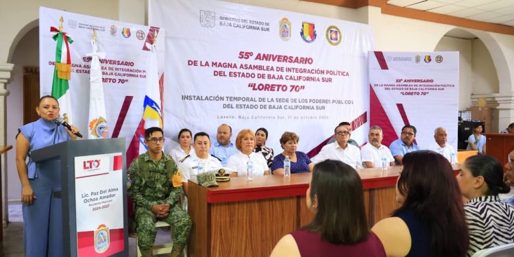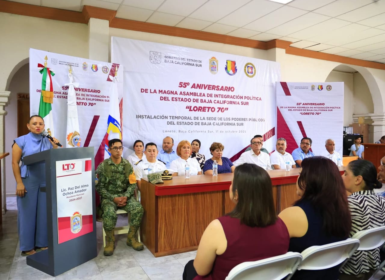 Loreto, B.C.S. 13 de octubre, 2025.- Al encabezar la ceremonia conmemorativa por el 55 Aniversario de la Integración Política de Baja California Sur “Loreto 70”, la alcaldesa Paz del Alma Ochoa Amador aseveró que Loreto es y ha sido un referente fundamental en el desarrollo de la vida política del estado y un ejemplo probado históricamente de cómo la voluntad y la determinación ciudadana, son cruciales para lograr la transformación de los pueblos.