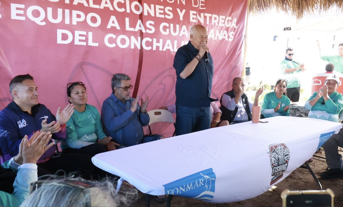 En compañía de la presidenta del Sistema Estatal para el Desarrollo Integral de la Familia (SEDIF), Patricia López Navarro; el mandatario sudcaliforniano otorgó también un apoyo consistente en una embarcación con motor fuera de borda a un grupo de mujeres que se dedica al cultivo de ostión.