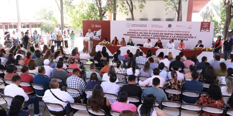 La Paz, Baja California Sur, a 14 de noviembre de 2025.- El gobernador Víctor Manuel Castro Cosío, en compañía del Secretario de Educación Pública a nivel federal, Mario Delgado Carrillo, encabezó la entrega de 500 nuevas plazas de base a personal docente y de apoyo y asistencia a la educación del nivel básico en Baja California Sur.