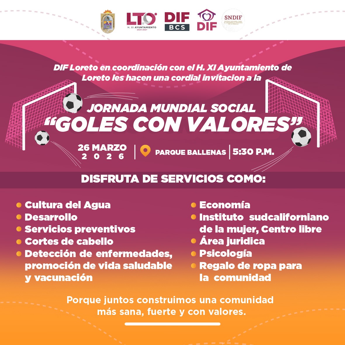 Loreto, B.C.S. 26 de marzo, 2026.- El Sistema Municipal para el Desarrollo Integral de la Familia de Loreto (SMDIF), en coordinación con el XI Ayuntamiento, lanzó la convocatoria dirigida a toda la ciudadanía para participar en la jornada mundial “Goles con Valores”, así lo indicó la directora de la institución, Cindy Janet Díaz Talamantes.