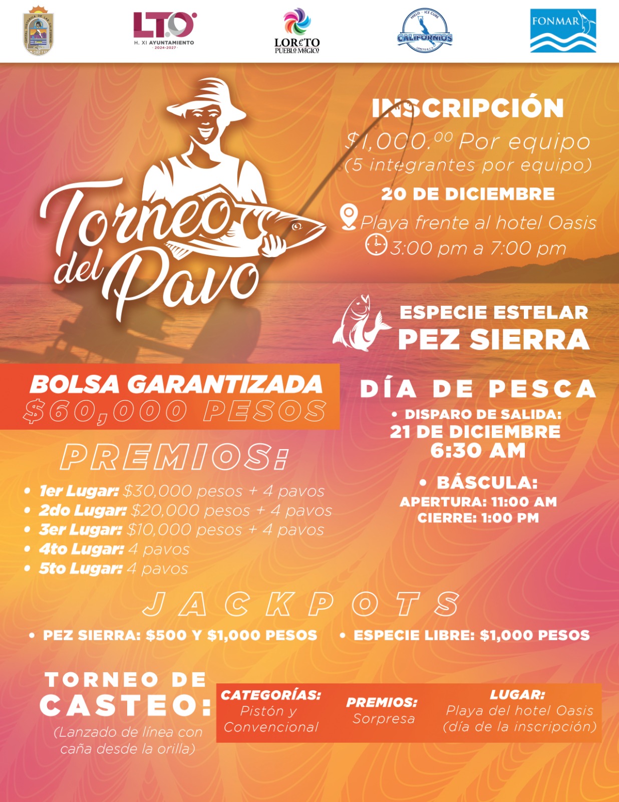 Loreto, B.C.S. 27 de noviembre, 2025.- Con una bolsa garantizada de 60 mil pesos, este miércoles la dirección de torneos de pesca deportiva del XI Ayuntamiento de Loreto, lanzó la convocatoria para el ya tradicional “Torneo del Pavo” que se realizará en la ciudad de Loreto los días 20 y 21 de diciembre próximos, en el marco de los festejos navideños.