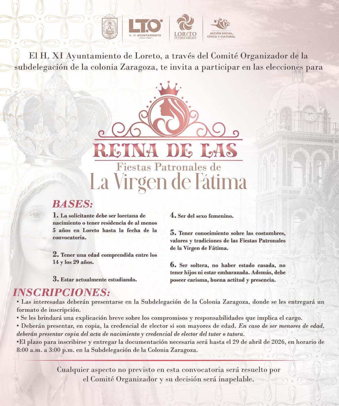 Loreto, B.C.S. 21 de abril, 2026.- Este lunes, el XI Ayuntamiento de Loreto lanzó la convocatoria dirigida a jóvenes interesadas en participar como candidatas a Reina de las tradicionales Fiestas Patronales de la colonia Zaragoza en honor a la Virgen de Fátima, una de las celebraciones culturales y comunitarias más representativas del municipio.