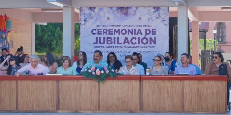 La ceremonia de jubilación se llevó a cabo en la Escuela Primaria “Civilizadores de Baja California”, institución en la que se desempeñó como maestra y en sus últimos años como directora. El acto reunió a autoridades educativas, personal del plantel, alumnos de distintas instituciones, amigos y familiares, quienes participaron en este merecido homenaje cargado de cariño, respeto y gratitud.