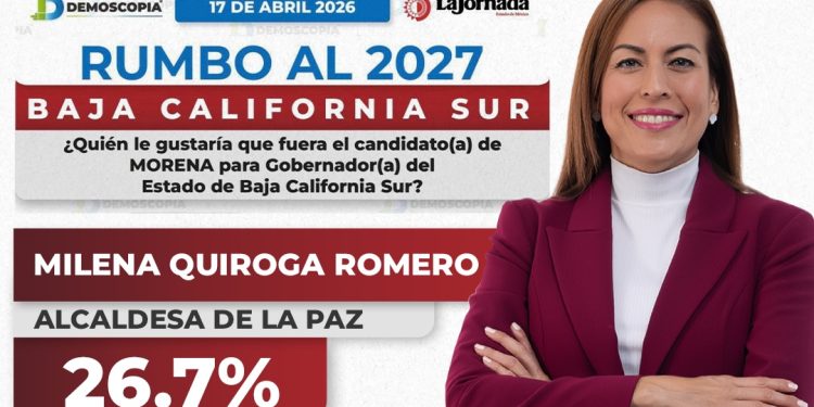 La Paz, Baja California Sur— a 19 de abril de 2026. La presidenta municipal de La Paz, Milena Quiroga Romero, se colocó en el primer lugar de las preferencias rumbo a la elección de gubernatura de Baja California Sur, de acuerdo con la encuesta publicada este 17 de abril por Demoscopia. El estudio la ubica como la figura mejor posicionada dentro de Morena y también como la aspirante con mayor ventaja en el primer careo de la contienda estatal.