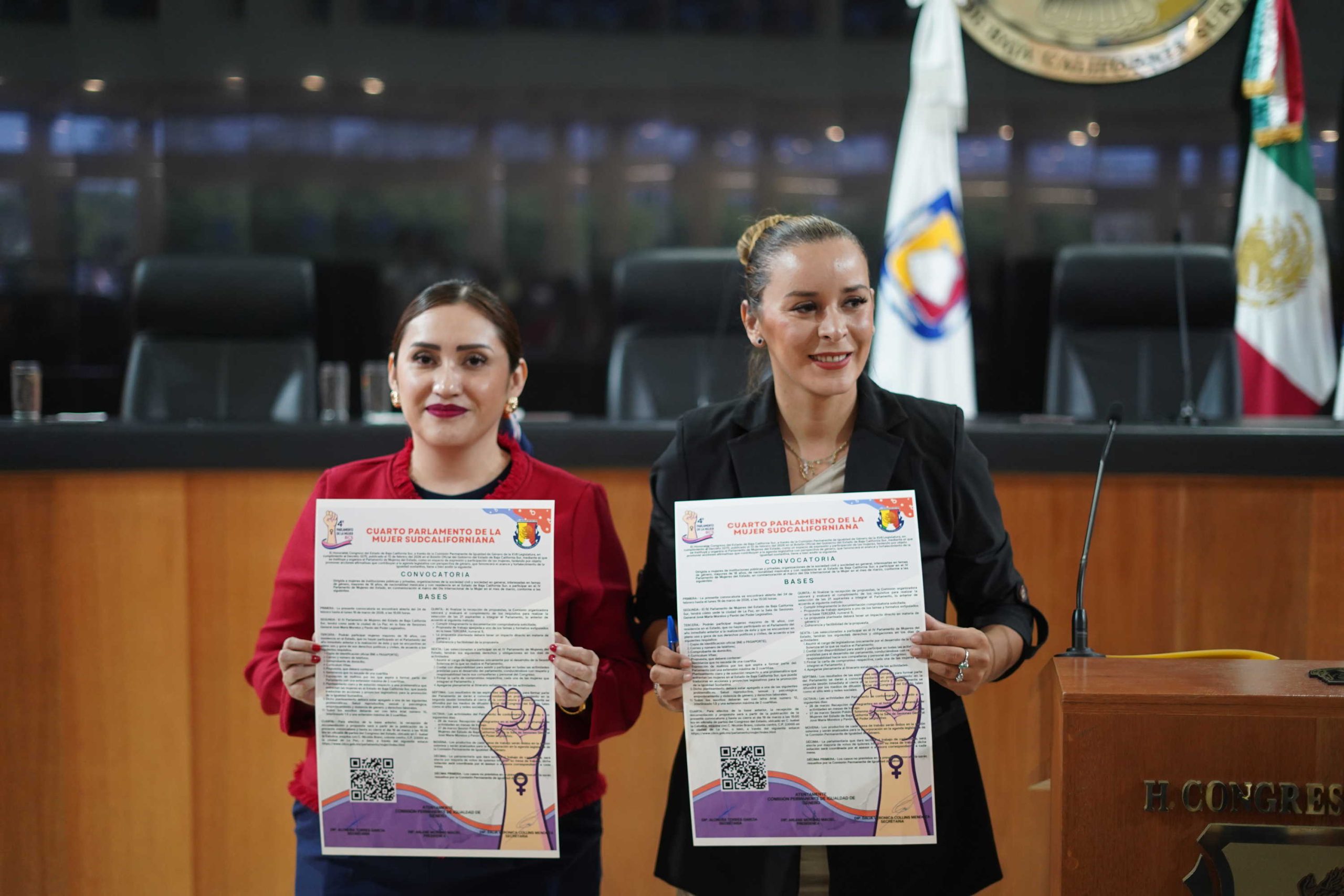 La Paz, BCS, 24 de febrero de 2026.- La mañana de este martes 24 de febrero, la diputada Arlene Moreno Maciel presidenta de la Comisión Permanente de Igualdad de Género en la XVII Legislatura en el Congreso del Estado de Baja California Sur, (que integra con las diputadas Alondra Torres García y Dalia Verónica Collins Mendoza), en compañía de la Dra. Claudia Gómez Sepúlveda, titular de la Unidad de Igualdad de Género en el Poder Legislativo, dio a conocer las bases de la convocatoria para participar en el 4° Parlamento de la Mujer Sudcaliforniana.