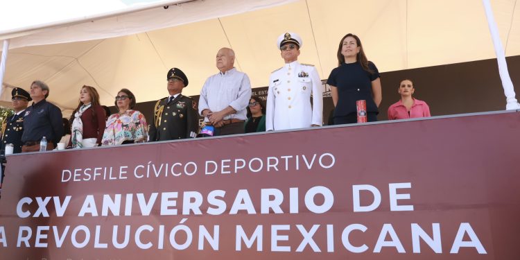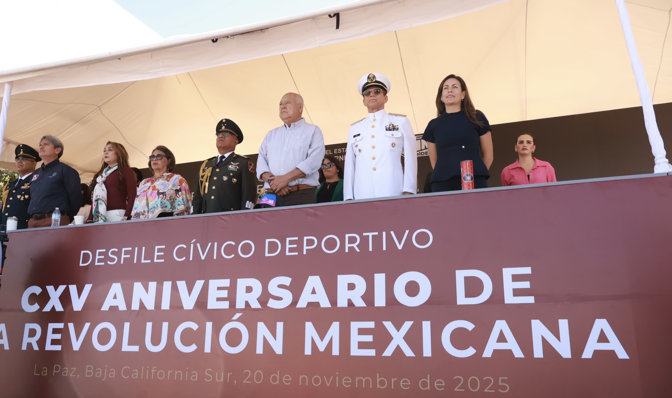La Paz, Baja California Sur, a 20 de noviembre de 2025.- El gobernador de Baja California Sur, Víctor Manuel Castro Cosío, encabezó la ceremonia oficial y el desfile cívico-deportivo por el CXV Aniversario del Inicio de la Revolución Mexicana, acompañado por los titulares de los poderes Legislativo y Judicial, los mandos de las Fuerzas Armadas y Guardia Civil, así como la alcaldesa de La Paz.