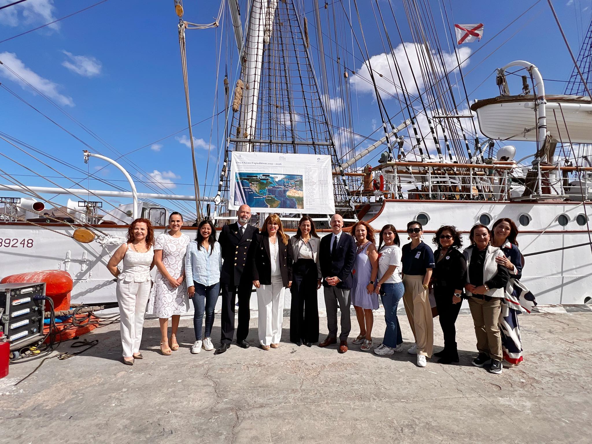 La Paz, Baja California Sur, a 24 de noviembre de 2025.- La secretaria de Turismo y Economía, Maribel Collins Sánchez, estuvo presente en la recepción oficial del velero noruego Statsraad Lehmkuhl, que arribó al Puerto de La Paz como parte de la One Ocean Expedition, un recorrido global de un año en el marco del Decenio de las Ciencias Oceánicas de la ONU.