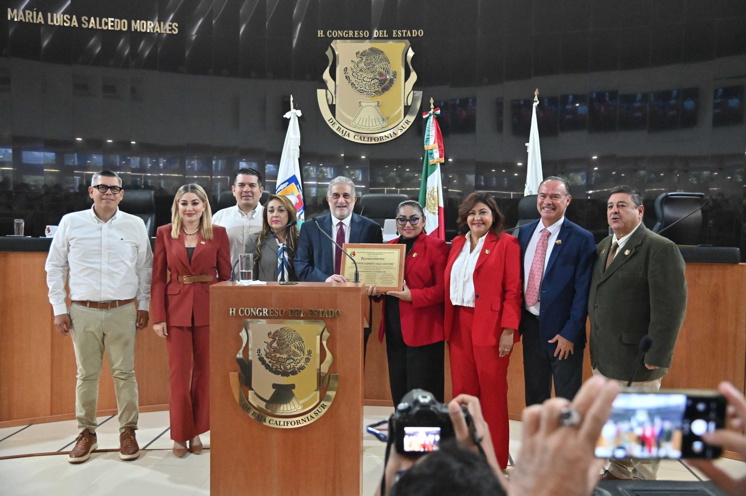 La Paz, Baja California Sur, 02 de diciembre del 2025.- Por su amplia trayectoria, trabajo y entrega al desarrollo social, científico, ecológico, educativo y humano en Baja California Sur, el Congreso del Estado entregó este 02 de diciembre, en sesión solemne, un reconocimiento público al Dr. Jorge Alberto Vale Sánchez.